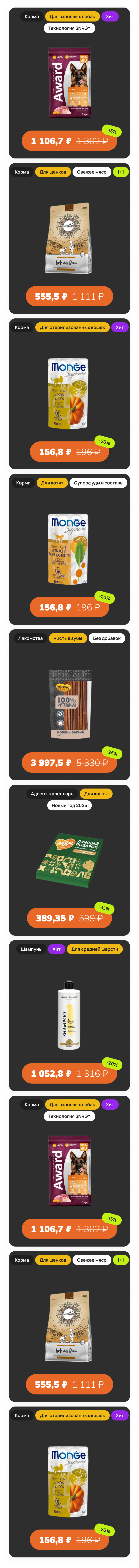 Совершите покупки на общую сумму товаров 7.000 рублей, среди которых есть хотя бы 1 позиция для собак, в период с 25.11. по 01.12, и вы автоматически станете участником розыгрыша запаса мясных палочек Monge Gift со свежей форелью и босвеллией для собак (28 штук).